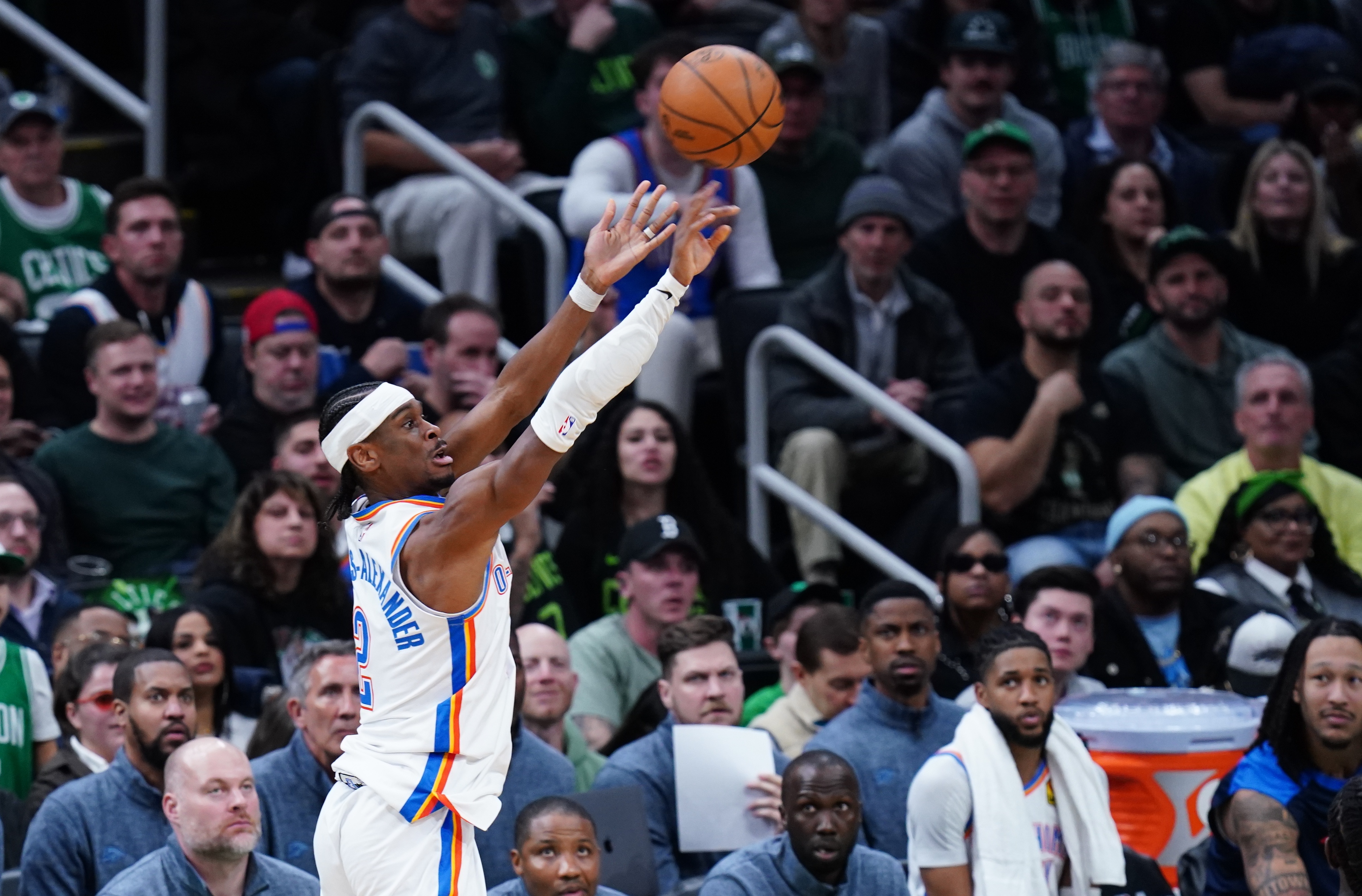 亞歷山大此役出戰(zhàn)38分鐘,投籃26中17,三分6中4,罰球10中10,砍下48分4籃板6助攻3搶斷1蓋帽,正負(fù)值+18。