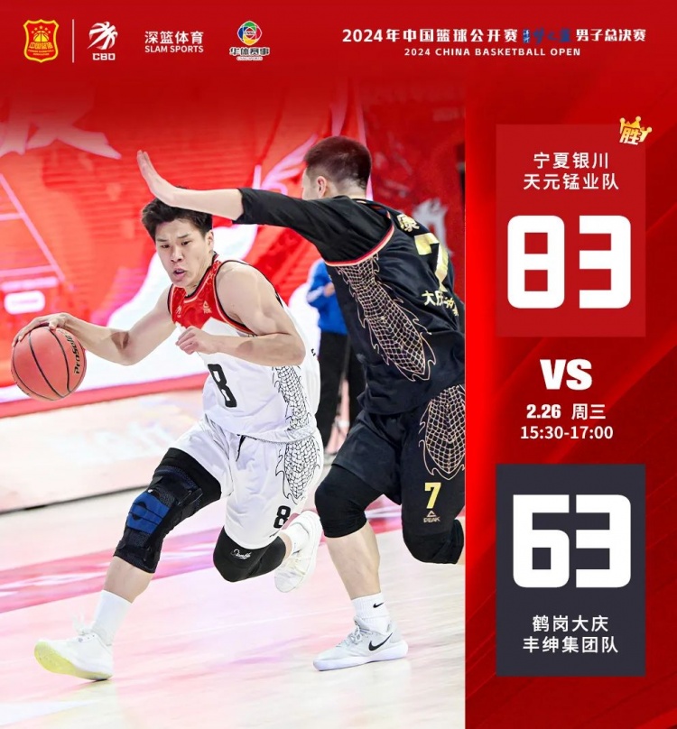 上半場,寧夏天元錳業一波7-0開局,打停大慶豐紳集團。暫停回來,寧夏天元錳業在搶到后場籃板后,積極組織快攻,11-1寧夏天元錳業領先。隨后大慶豐紳集團增強防守,同時手感開始回暖,但寧夏天元錳業在前后場籃板和進攻上發揮的更加出色。半場結束,寧夏天元錳業44-24大慶豐紳集團。下半場,寧夏天元錳業繼續保持進攻勢頭,最終天元錳業83-63大慶豐紳集團。