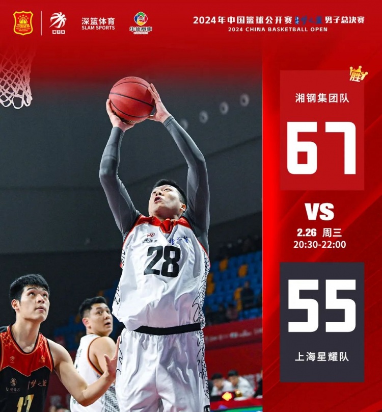 上半場開始,湘鋼集團進攻十分強勢,取得9-4領先。26號陳雙、28號蔡士港相繼投籃命中,上海星耀出現失誤,首節湘鋼集團24-11領先上海星耀。次節,上海星耀加強防守并在籃板的拼搶中更積極主動。但湘鋼集團沒有給其太多機會,半場結束,湘鋼集團領先上海星耀16分。下半場,兩隊沒有拉開太大分差,依靠上半場的領先優勢,湘鋼集團以67-55戰勝上海星耀。