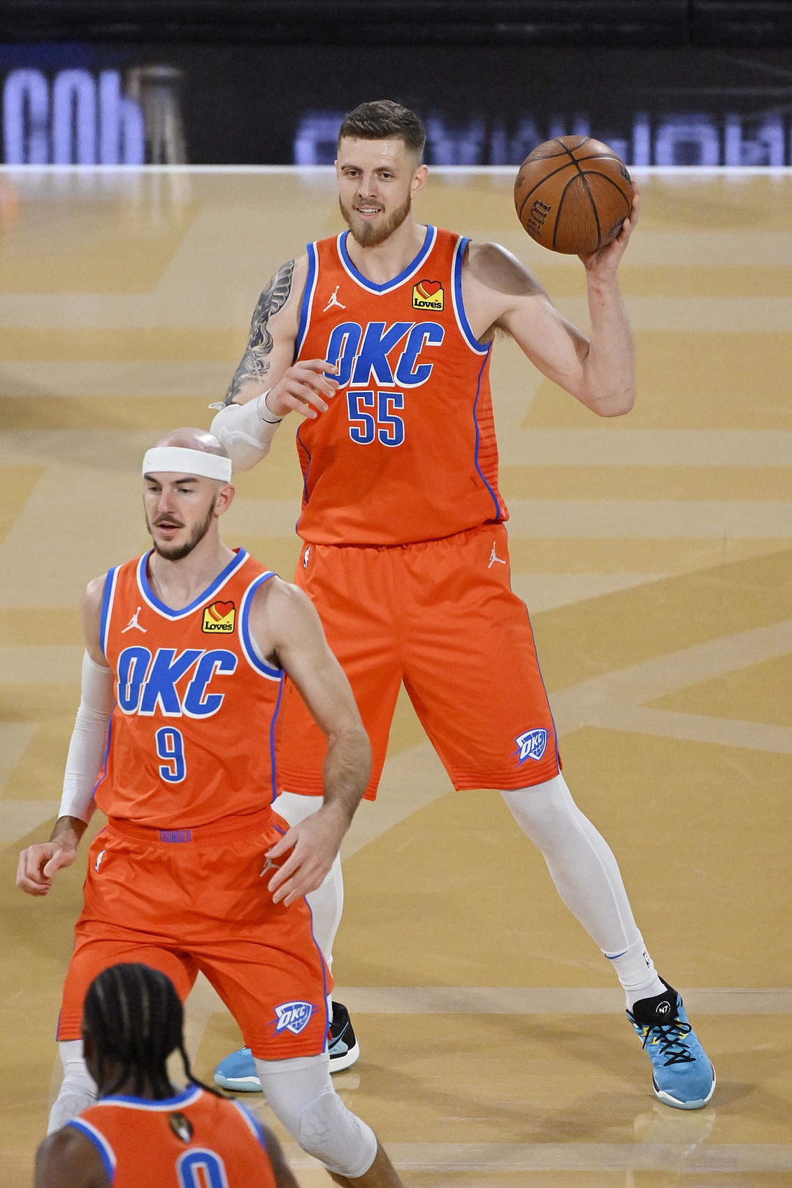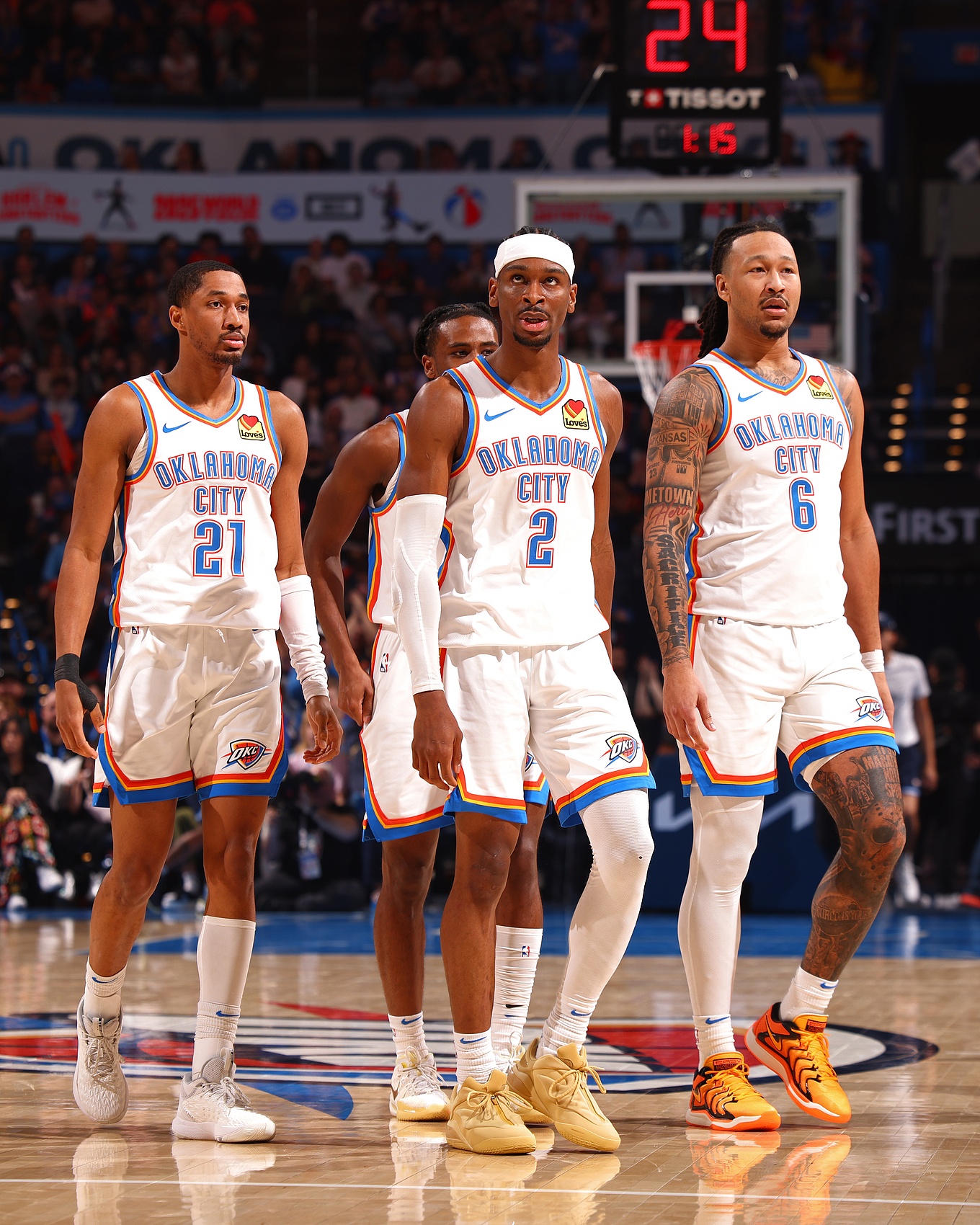 2023-24賽季,戴格諾特教練帶著25歲的亞歷山大、22歲的杰倫-威廉姆斯、21歲的霍姆格倫、24歲的多特、21歲的基迪、20歲的卡森-華萊士、21歲的杰林-威廉姆斯、24歲的以賽亞-喬、25歲的阿隆-維金斯、29歲的肯里奇-威廉姆斯更進一步,他們進攻效率第3、防守效率第4,常規(guī)賽豪取57勝25負,登頂西部第一!