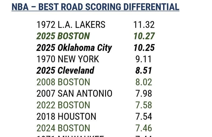 據統計,本場比賽過后,凱爾特人的賽季場均客場凈勝分來到10.27,超越本賽季的雷霆(10.25),升至歷史第二位,僅次于1972年的湖人。