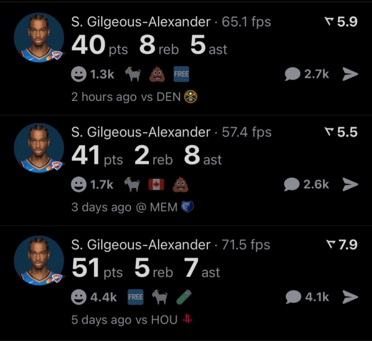 這樣以來,亞歷山大已經連續3場比賽砍下40+,雷霆隊史繼威少后第二人!
