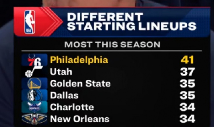 本賽季首發(fā)套數(shù):76人41套高居第一 勇士獨行俠35套并列第三