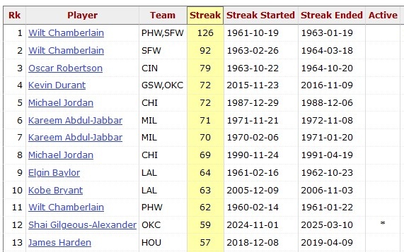 據(jù)統(tǒng)計(jì),這是亞歷山大連續(xù)第60場(chǎng)比賽砍下20+,他也成為NBA歷史上第8個(gè)做到這點(diǎn)的球員。另外7人分別為:張伯倫、奧斯卡-羅伯特森、杜蘭特、喬丹、賈巴爾、埃爾金-貝勒、科比。
