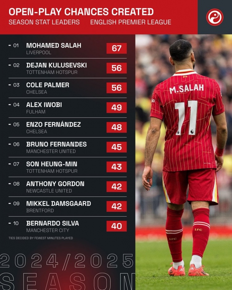 本賽季英超運動戰(zhàn)創(chuàng)造機會榜:薩拉赫居首,帕爾默、B費、B席在列