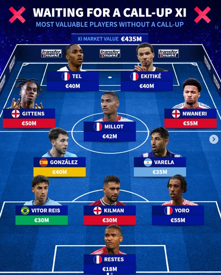 3月22日訊 本月的國(guó)家隊(duì)比賽正在進(jìn)行中,《轉(zhuǎn)會(huì)市場(chǎng)》也列出了仍未獲得國(guó)家隊(duì)征召的當(dāng)前最貴陣,法國(guó)5將在列。
