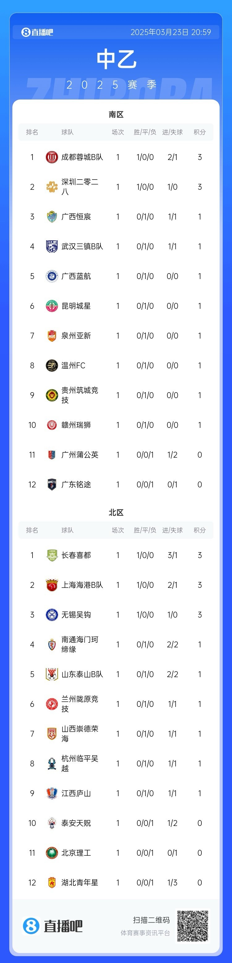 3月23日訊 中乙聯賽第一輪今天結束全部爭奪,蓉城B隊2-1擊敗廣州蒲公英,三鎮B隊戰平廣西恒宸,無錫吳鉤、長春喜都、深圳二零二八收獲開門紅。
