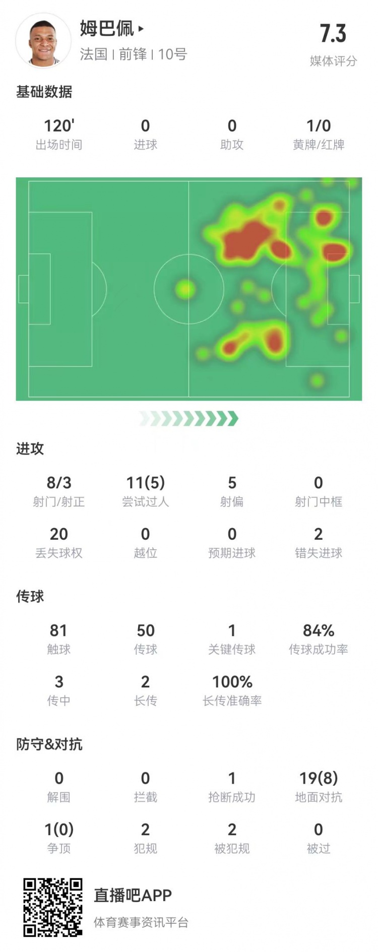 姆巴佩本場8射3正+2失良機(jī)+點射命中 20對抗8成功+20丟失球權(quán)