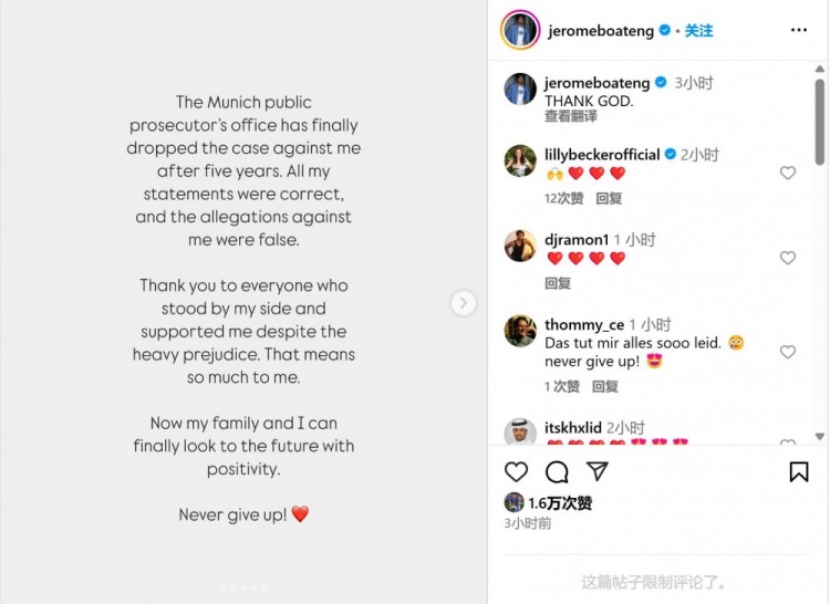 博阿滕更新社媒,慶賀針對他的家暴指控被撤銷