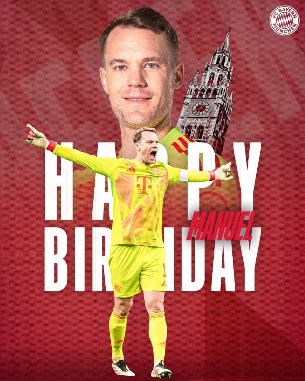 3月27日訊 德國隊和拜仁官方社媒更新動態,為諾伊爾送上生日祝福。