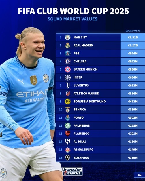 世俱杯參賽球隊身價排行:曼城13.1億歐居首 皇馬巴黎藍軍拜仁2-5