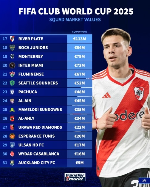 3月27日訊 德轉列已經確定參加今年世俱杯的31隊身價排名,曼城、皇馬、巴黎排在前三,17支球隊總身價過億。