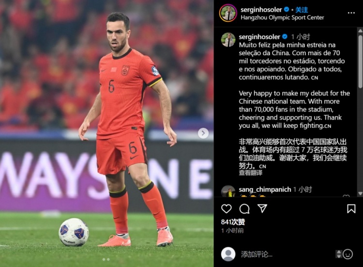 塞爾吉尼奧更新個人社媒,曬出個人賽場照,并用中英葡三種語言寫道:非常高興能夠首次代表中國國家隊出戰。體育場內有超過 7 萬名球迷為我們加油助威。謝謝大家,我們會繼續努力。