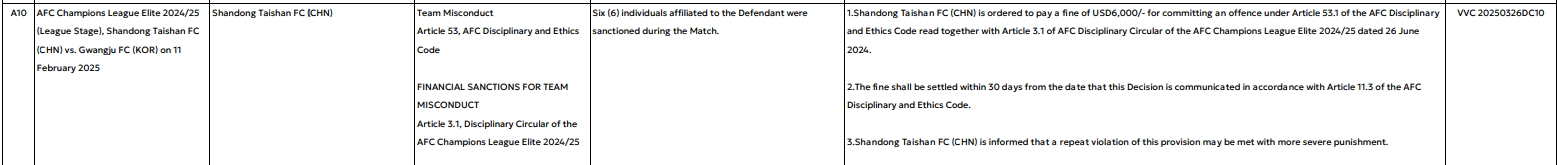 - 又被罰了!亞足聯(lián)官方:泰山對(duì)陣光州時(shí)6人染黃,罰款6000美元
