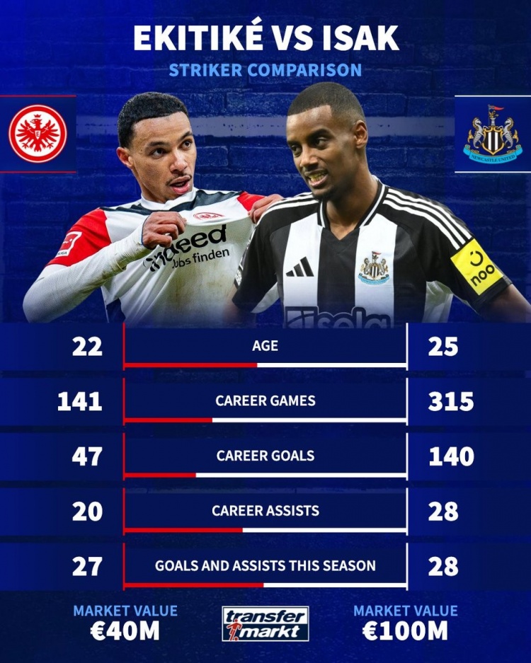 伊薩克(紐卡斯爾,25歲):生涯315場140球28助攻,本賽季直接參與28球,德轉身價1億歐元