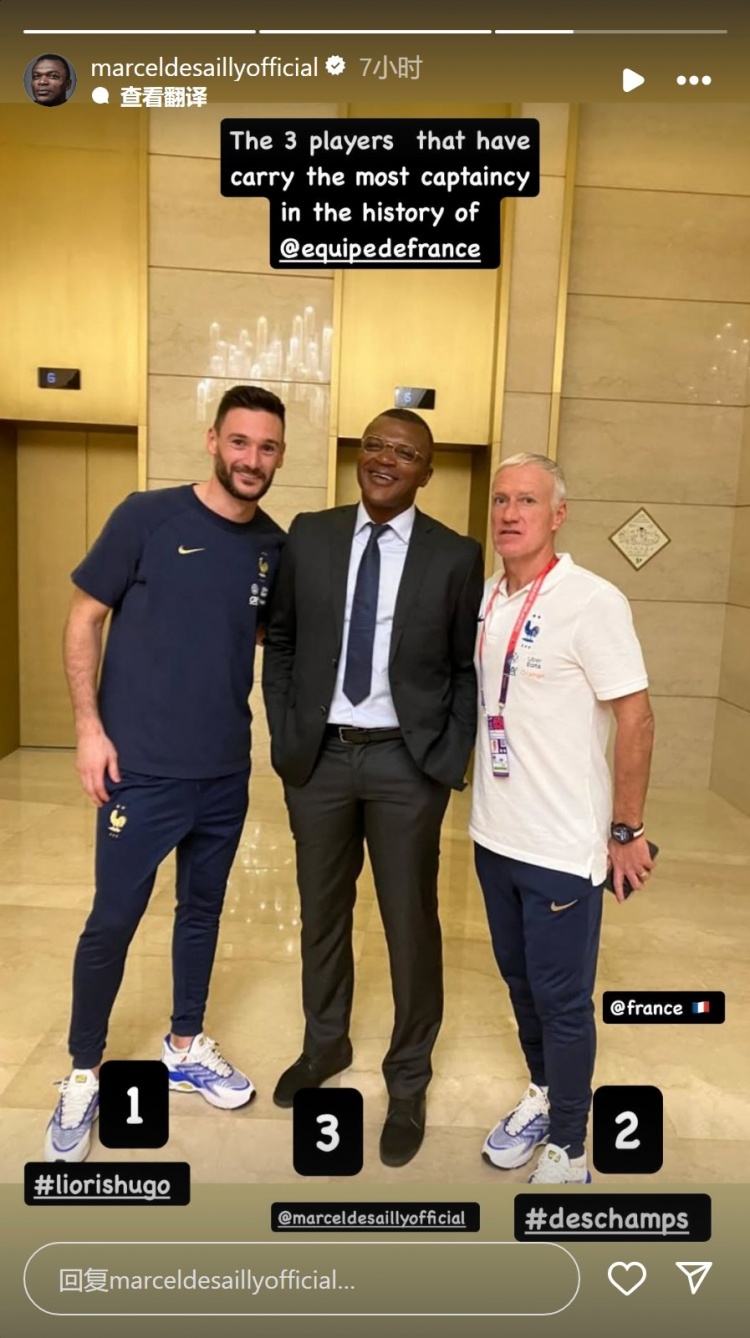 德塞利社媒曬出與德尚、洛里的合照,并配文:“法國隊史擔任隊長次數(shù)最多的三名球員。”
