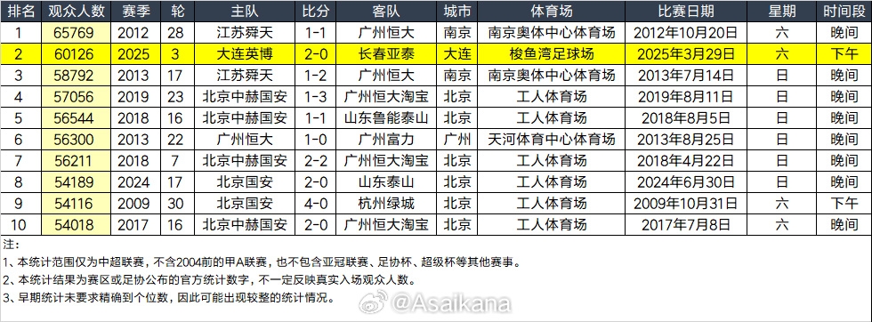 - 大連英博和長春亞泰吸引60126名觀眾現場觀戰,中超歷史排名第二