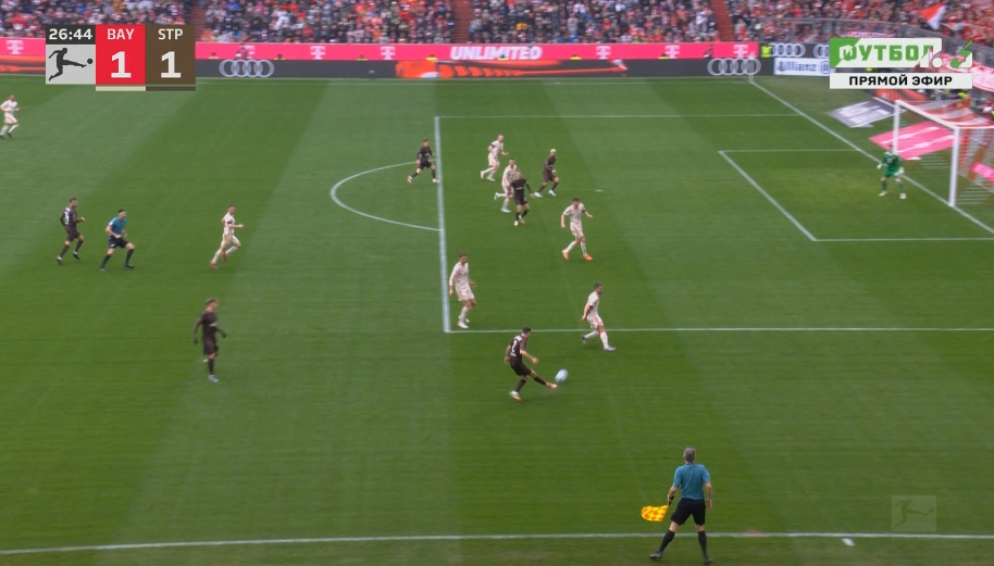 03月29日訊 拜仁v圣保利第28分鐘,拜仁后點漏人!圣保利球員埃利亞斯-薩德輕松包抄破門,拜仁第28分鐘丟球1-1圣保利!