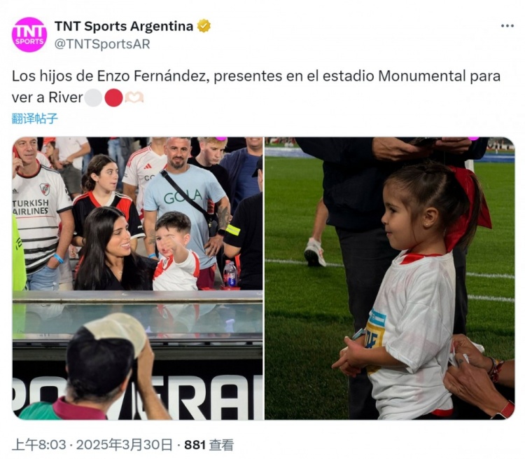 瓦倫蒂娜帶著孩子們來到紀念碑球場,現場觀看河床隊的比賽。恩佐出身于河床青訓,他與瓦倫蒂娜去年曾分手,兩人今年1月份宣布復合。