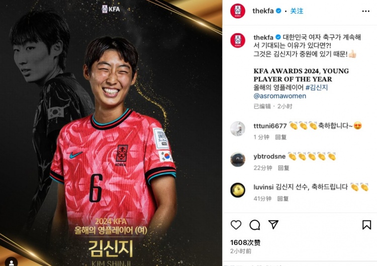 - 官方:34歲韓國(guó)女足名將池笑然當(dāng)選韓足協(xié)2024年度最佳女足球員