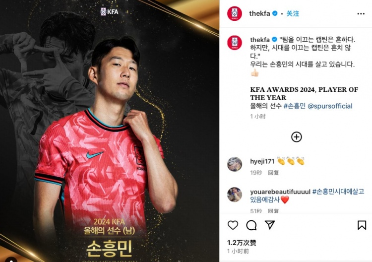 官方:孫興慜當選韓足協2024年度最佳球員,第8次獲得該獎項