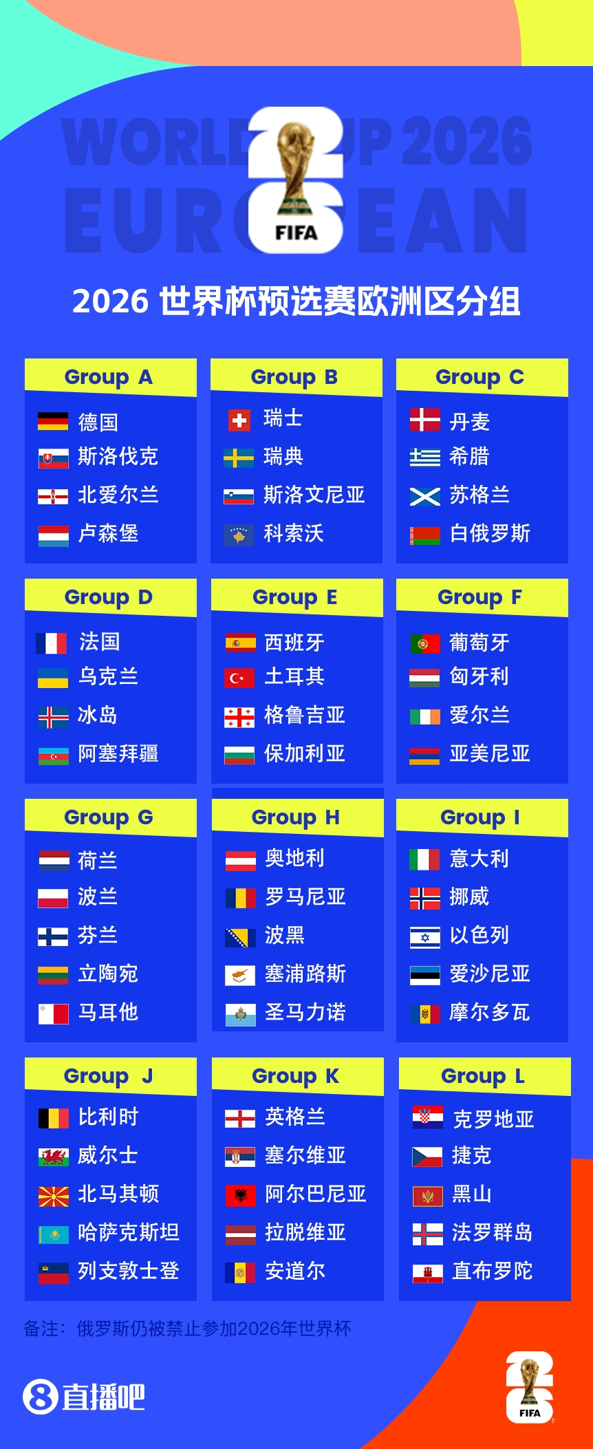 2026年美加墨世界杯歐足聯共計有16個參賽名額,其中12個小組的頭名將直接獲得世界杯參賽資格,其余4個席位由12個小組的第二名通過附加賽決出。