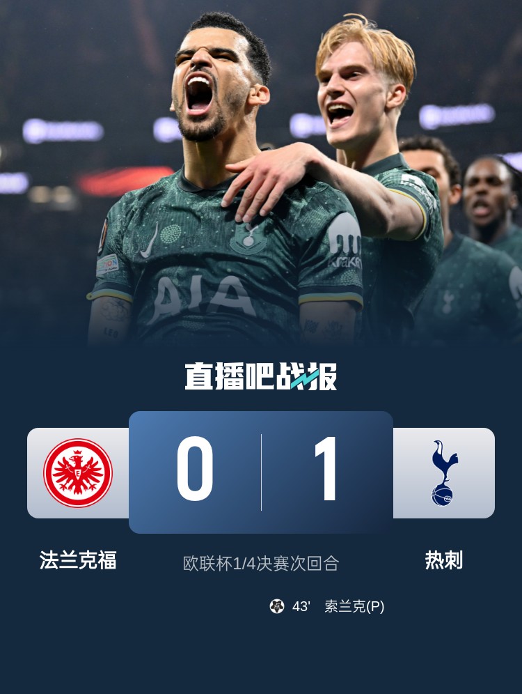 索蘭克點射建功,最終熱刺1-0客勝法蘭克福,總比分2-1晉級四強。