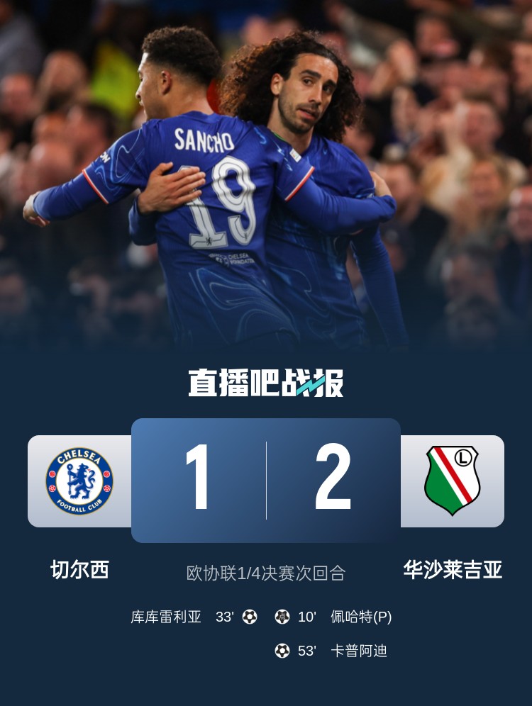 切爾西1-2不敵華沙萊吉亞,以兩回合總比分4-2淘汰對手,晉級歐協聯四強。