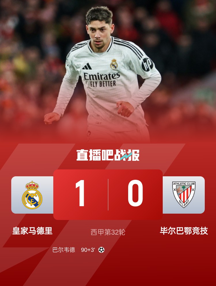 皇馬1-0絕殺畢巴,巴爾韋德又一次用世界波為球隊搶下寶貴3分。