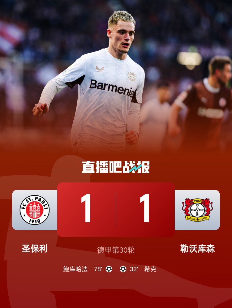 德甲-勒沃庫森1-1圣保利距榜首8分 希克頭球破門格里馬爾多獻助攻