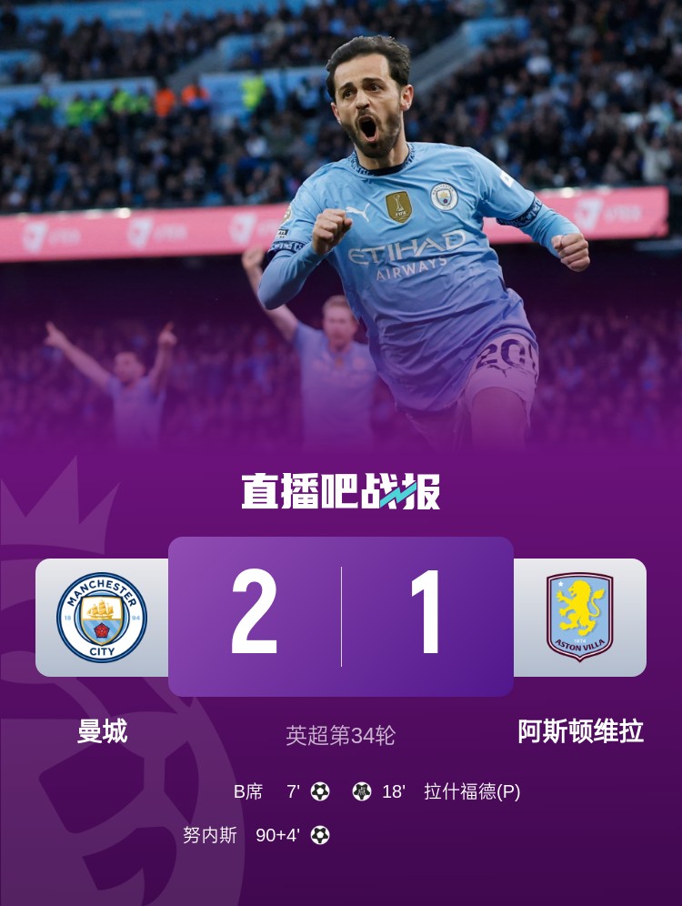 英超第34輪,曼城2-1戰勝維拉,終結維拉英超5連勝。上半場,拉什福德開場中柱,隨后B席破門,迪亞斯送點,拉什福德點射扳平;下半場,馬爾穆什破門但越位無效,多庫94分鐘助攻努內斯絕殺。