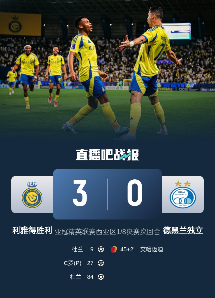 亞冠精英聯賽西亞區1/8決賽次回合,C羅進球,杜蘭梅開二度,利雅得勝利3-0德黑蘭獨立,晉級亞冠八強。