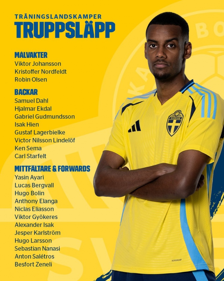 中前場(chǎng):阿亞里(布萊頓)、貝里瓦爾(熱刺)、博林(馬爾默)、伊蘭加(諾丁漢森林)、埃利亞松(雅典AEK)、約克雷斯(葡萄牙體育)、伊薩克(紐卡)、卡爾斯特羅姆(烏迪內(nèi)斯)、雨果-拉爾森(法蘭克福)、納納西(斯特拉斯堡)、薩萊特羅斯(AIK索爾納)、澤內(nèi)利(埃爾夫斯堡)